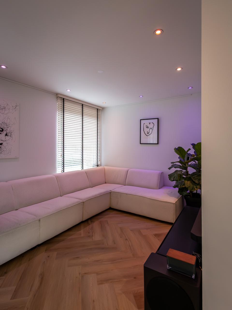 De visgraatvloer in combinatie met vloerverwarming zorgt voor comfort, terwijl de slimme Philips Hue-spotjes de sfeer volledig naar wens instelbaar maken. Ook de volledige elektra op deze verdieping is opnieuw aangelegd, zodat alles klaar is voor de toekomst.